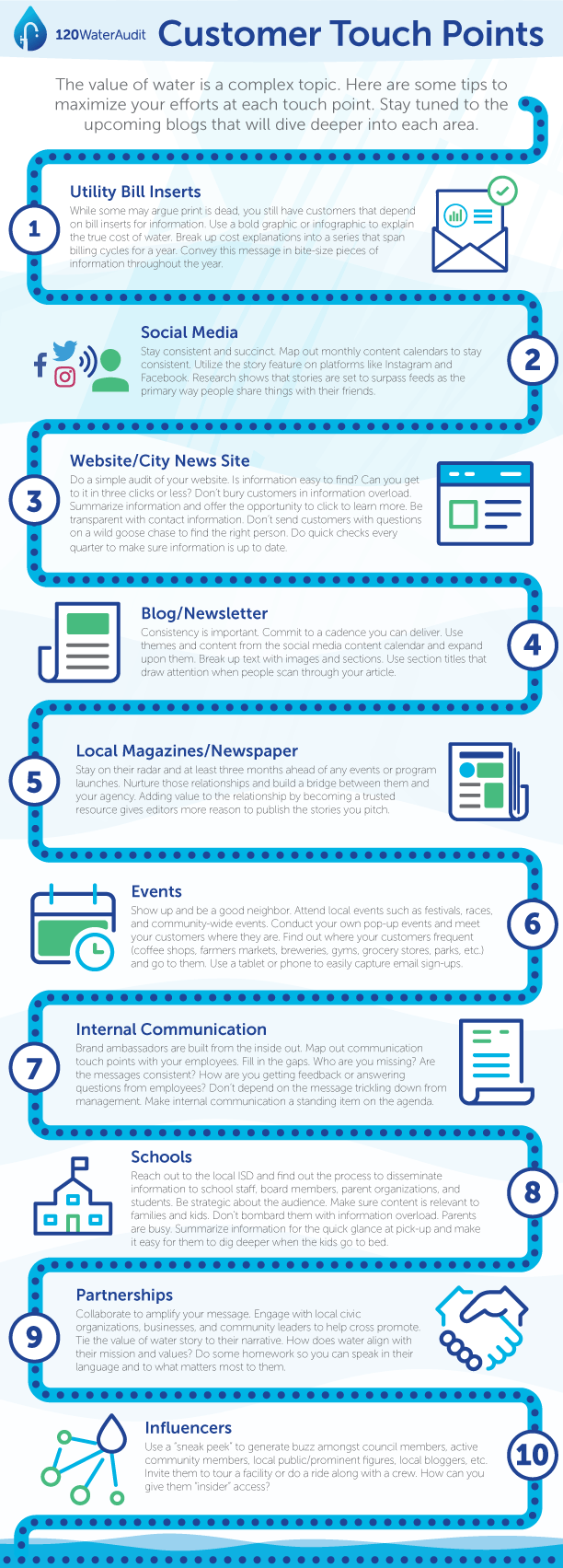 One of the most important shifts happening in water is thinking of those who serve as “customers” rather than “ratepayers.” Doing this requires you to evaluate each touch point you have with your customer and find ways to communicate the value of the water that you deliver. This infographic outlines some tips to maximize each of those touch points.